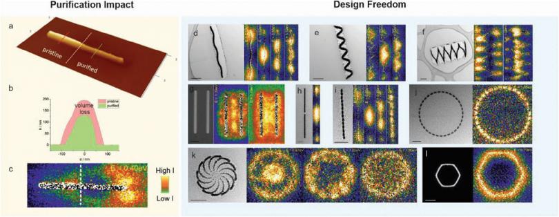 不同平面結(jié)構(gòu)的等離子體測量結(jié)果。(a)為利用FusionScopeTM的原位AFM測量的在制備后和清除后的微納結(jié)構(gòu)變化區(qū)別。(b)為通過原位AFM測量的在去除前后所制備納米結(jié)構(gòu)的體積變化。(c)為部分去除樣品的STEM-EELS能譜。(d-l)為不同設(shè)計(jì)下的等離子體測量結(jié)果