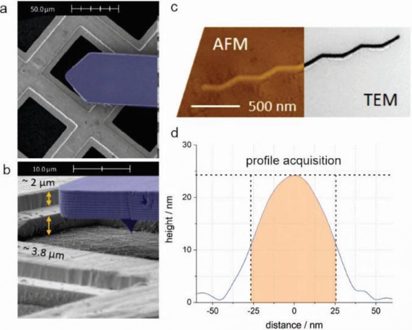 利用FusionScopeTM獲取用于模擬的數(shù)據(jù)。(a-b)在FusionScopeTM中利用SEM對AFM進(jìn)行引導(dǎo),在放置在TEM網(wǎng)格上的Au納米線進(jìn)行測量。(c)對FusionScopeTM所獲得的數(shù)據(jù)和TEM所獲得的數(shù)據(jù)進(jìn)行相互驗(yàn)證。(d)FusionScopeTM測量Au納米線的高度為24 nm,半峰寬為51 nm