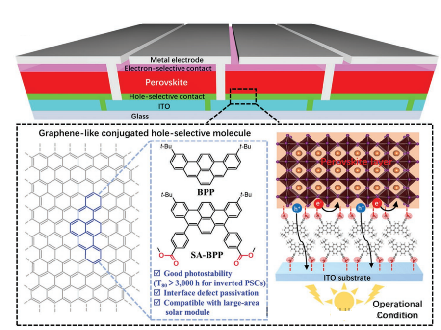 鈣鈦礦吸收層與空穴傳輸層之間界面的相互作用是影響鈣鈦礦電池穩(wěn)定性的關(guān)鍵因素。對(duì)此,戚亞冰教授研究團(tuán)隊(duì)制備了***種類石墨烯共軛結(jié)構(gòu)的自錨式苯并[rst]五酚(SA-BPP)分子,用以替代傳統(tǒng)的三苯胺和咔唑基的空穴選擇性分子,成功開發(fā)了新型的空穴選擇性接觸層。研究表明,使用SA-BPP制備的IPSCs具有更高的光穩(wěn)定性和光電轉(zhuǎn)換效率。此外,SA-BPP分子結(jié)構(gòu)中的錨定基團(tuán)還可促使ITO基底上形成大規(guī)模的均勻的空穴接觸,并有效地鈍化鈣鈦礦吸光層。