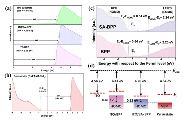 圖2.(a)ITO、ITO/BPP、ITO/SA-BPP與(b)CsFAMAPbI3薄膜的UPS譜圖;(c)ITO/BPP、ITO/SA-BPP的電子能帶結(jié)構(gòu);(d)ITO、ITO/BPP、ITO/SA-BPP和鈣鈦礦CsFAMAPbI3薄膜的能***圖,EF紅色虛線表示。