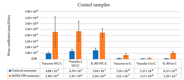 圖5:通過ASTM G99標(biāo)準(zhǔn)(橙色圖)和共聚焦(藍(lán)色圖)測量的樣品磨損系數(shù)值的比較圖。
