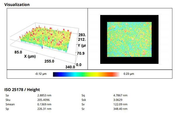 此外,還可以輕松測量樣品的表面粗糙度和輪廓粗糙度,然后對比使用共聚焦和干涉測量這兩種不同的測量技術(shù)獲得的數(shù)值。通過這種方式,可以保證得到的粗糙度值的精度?;牡拇植诙瓤赡苁峭繉优c基材之間附著力的決定因素。