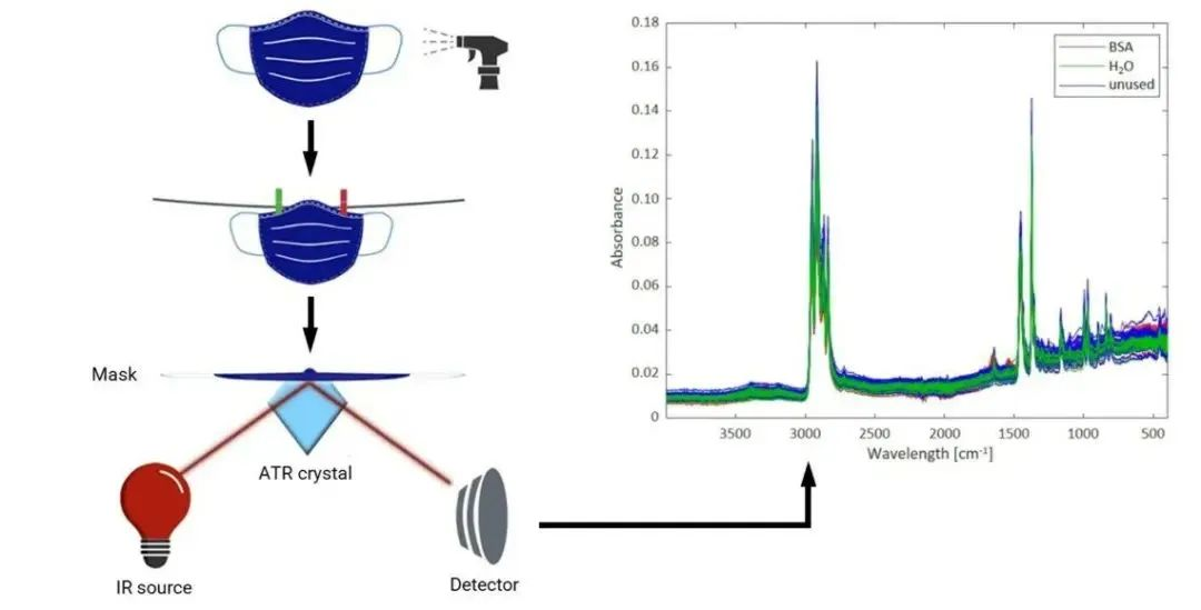 由于紅外光譜技術(shù)擁有不具有破壞性、快速高效且具有成本效益的特點,因此該技術(shù)尤其適用于這項研究。此外,該技術(shù)還能夠可靠地提供相關(guān)大量有機和無機物質(zhì)的分子信息。對于這個試驗,實驗人員選擇了使用了***種將衰減全反射紅外光譜(ATR)及數(shù)據(jù)分析與多元統(tǒng)計算法相結(jié)合的試驗方法。***先,實驗人員在口罩上噴灑水、蛋白質(zhì)(BSA)和病毒樣顆粒(VLP)。然后,待口罩干燥后,使用配備單次反射ATR附件的布魯克ALPHA II對其進行檢測(圖1)。