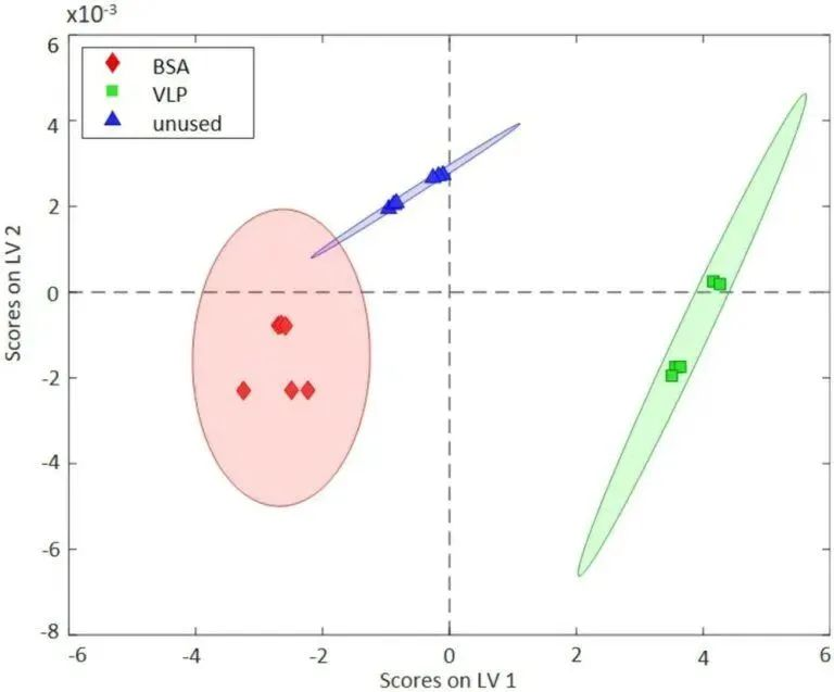 該模型(圖2)明確反映了這兩類物質(zhì)(BSA和VLP)之間的差異。這表明,即使基于極小的光譜差異,也能實現(xiàn)病毒檢測及潛在鑒別。通過這項研究,Schorer等人為病毒檢測引入了***套新工具。