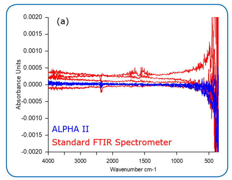 圖3:ALPHA II基線重復(fù)性與標(biāo)準(zhǔn)FT-IR光譜儀的基線重復(fù)性相比較(TR,4 cm-1,20秒測試)