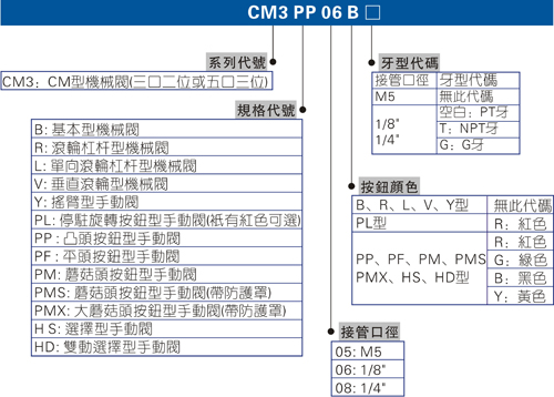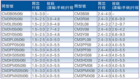 3、CM3B、CM3L、CM3V、CM3R、CM3PM、CM3PMS、CM3PMX、CM3PF、CM3PP系列為自動(dòng)復(fù)位。CM3Y、CM3HS、CM3HD、CM3PL手動(dòng)閥為手動(dòng)復(fù)位。其中CM3PL押入定位后,須旋轉(zhuǎn)旋轉(zhuǎn)鈕才能復(fù)位;