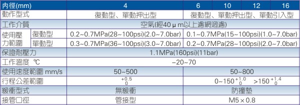 7、Φ4缸徑氣缸負(fù)載須與氣缸同軸,避免側(cè)向負(fù)載,否則活塞桿會彎曲變形且損壞桿端螺紋。單動(dòng)型不可在回程時(shí)加載;