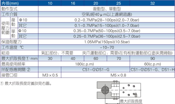 4、作動(dòng)方式為活塞桿推出時(shí)夾緊,縮回時(shí)張開,夾緊力比張開力大20%~30%;