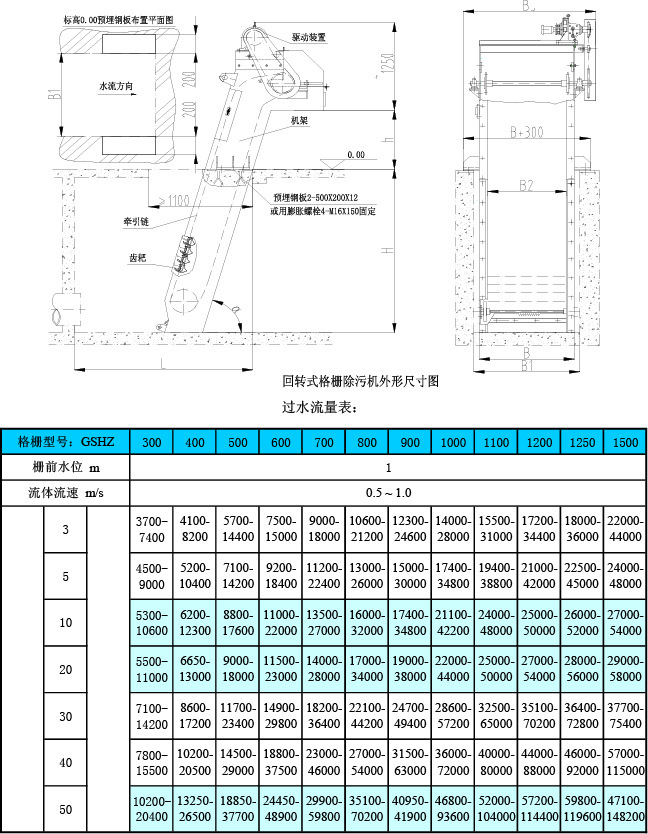 按設(shè)備寬W0 格柵機(jī)分:單聯(lián)機(jī)GSHZ300-1400 型、并聯(lián)機(jī)GSHZ1400-3000 型。選型由過(guò)水量、提升高度而定,同時(shí)根據(jù)所分離雜物的大小選配不同格柵。