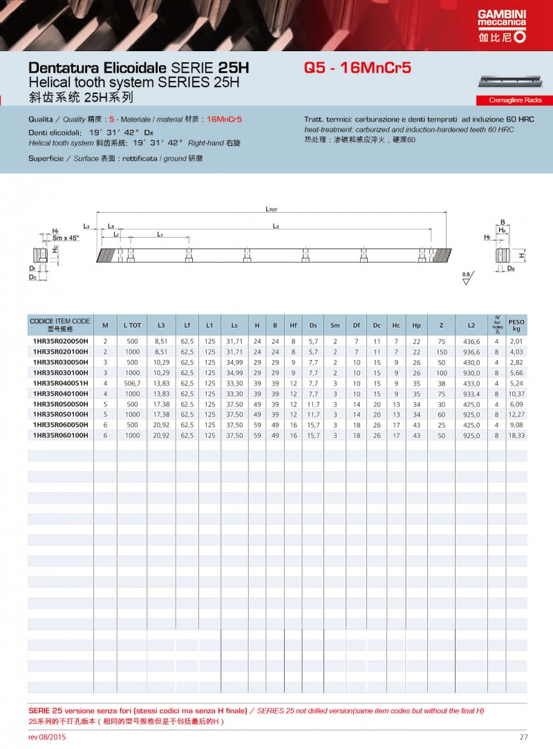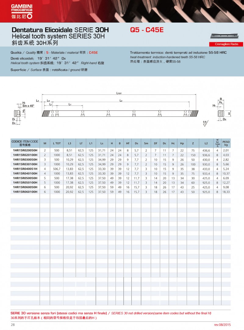Gambini可使用不同類型的原材料生產(chǎn)高精度的直齒條和斜齒條。我們生產(chǎn)的齒輪齒條模數(shù)范圍為M0.5到M42,品質(zhì)等 范圍Q5到Q10。品質(zhì)等 Q5的齒條長度為1000mm,如果品質(zhì)等 為Q6,可生產(chǎn)的單件長度可達(dá)2000mm。Gambini高精度的齒條和齒輪廣泛應(yīng)用激光切割;CNC機(jī)床、三坐標(biāo)測量儀、 七軸機(jī)器人等.產(chǎn)品有多種不同類型的熱處理方法。市面上***常使用和要求加工的是感應(yīng)淬火齒條和表面硬化和感應(yīng)淬火的齒輪。當(dāng)然,我們也生產(chǎn)不需要熱處理的產(chǎn)品(所有我們的型號)。通過特殊研究,我們也可生產(chǎn)保護(hù)工件(防腐蝕和防磨損)的不同類型的表面處理;也可進(jìn)行特殊上色和表面彩色處理。