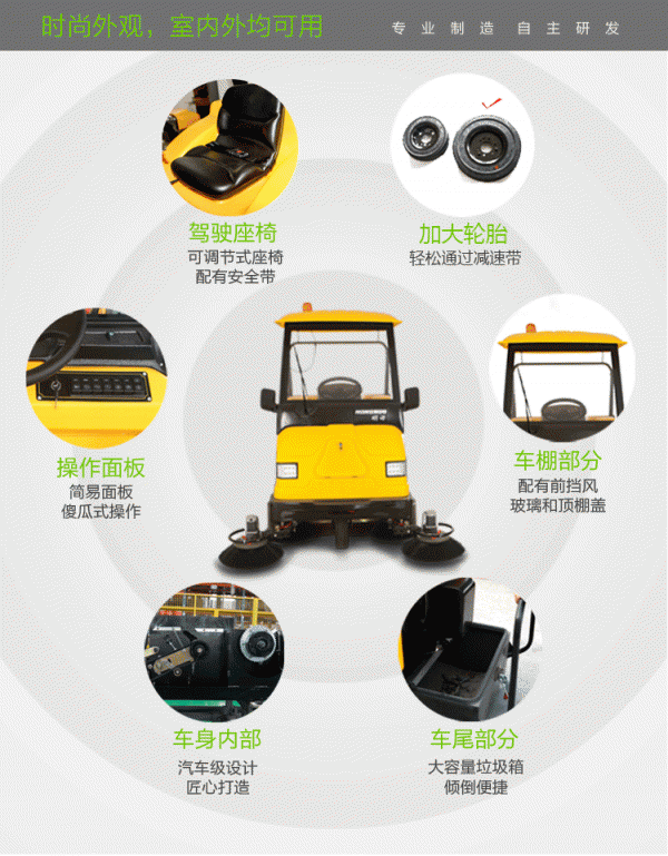 三輪電動清掃車性能特點:加大底盤設計,工作效率高,實心加大輪胎,輕松過減速帶,整車通過性好。大型粉塵過濾器,可完全清理灰塵,電動震動器可以自動清潔過濾網。采用 進的高性能免維護蓄電池,不漏液,不產生有害氣體,可選配鋰電清掃車。該機擁有 進的清掃拋甩技術,塵箱利用率高。全LED大燈,高壓霧化降塵系統(tǒng),避免二次揚塵。可靠的電控系統(tǒng),過流、欠壓保護;行車系統(tǒng)具有坡道行走保障功能??蛇x配PFC充電機。