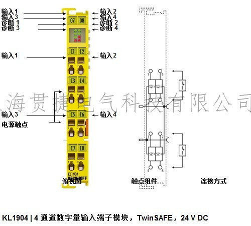 安全總線端子模塊 KL1904 是 種數(shù)字量輸入端子模塊,用于帶無(wú)電位觸點(diǎn)的 24 V DC 傳感器。KL1904 有四個(gè)故障-安全輸入,符合 IEC 61508 SIL 3 和 EN 954 Cat. 4 標(biāo)準(zhǔn)。