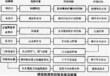 根據(jù)燒結(jié)工藝流程的特點,將燒結(jié)過程劃分為原料準備系統(tǒng)、配料系統(tǒng)、混合系統(tǒng)、燒結(jié)系統(tǒng)、冷卻系統(tǒng)、成品管理系統(tǒng)、余熱回收及主排氣系統(tǒng)、除塵和水處理系統(tǒng)等若干個子系統(tǒng)分別實現(xiàn)分散控制、集中管理。主要的檢測和控制功能如下圖所示。