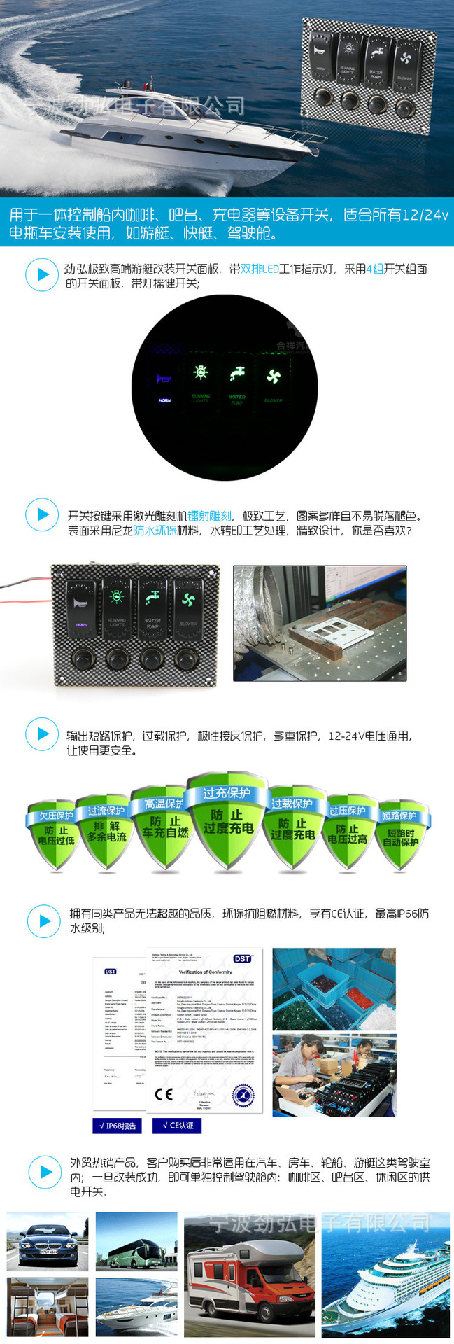 勁弘電子游艇快艇汽車房車 4組水轉(zhuǎn)印開關(guān)控制面板