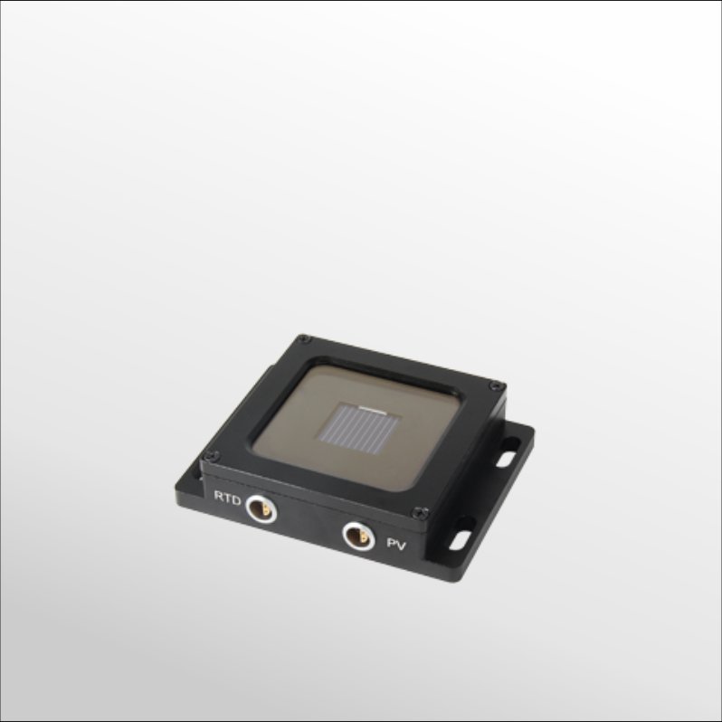 標(biāo)準(zhǔn)太陽(yáng)電池為2cm*2cm 的單晶硅或多晶硅(可依據(jù)用戶需要定制)光伏電池,經(jīng)過(guò)老化、篩選,選擇穩(wěn)定性好、表面均勻的進(jìn)行全密封式封裝。太陽(yáng)電池置于方形鋁基座的中心,并配有 個(gè)抗輻照玻璃保護(hù)窗口,窗口的封裝采用透明性好,折射系數(shù)相近的光敏膠。太陽(yáng)電池的下面裝有Pt100鉑電阻溫度傳感器,在封裝前已進(jìn)行標(biāo)定。太陽(yáng)電池和測(cè)溫傳感器均采用四端輸出的Kelvin連接接線方式。