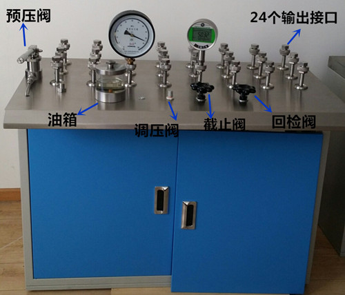 SD-318多輸出口壓力校驗臺由調(diào)壓閥,回檢閥,預(yù)壓閥和截止閥,多個壓力輸出接口組成,整體固化結(jié)構(gòu),樣式新穎,操作簡單,便于維護,具有密封性能好,升壓平穩(wěn),速度快,省力,操作簡單等優(yōu)點。多輸出口壓力校驗臺,24個輸出接口, 次可檢同量程多塊壓力表,量大壓力檢定的好解決方案,大大提高工作效率,不同輸出接口可根據(jù)需要定制。