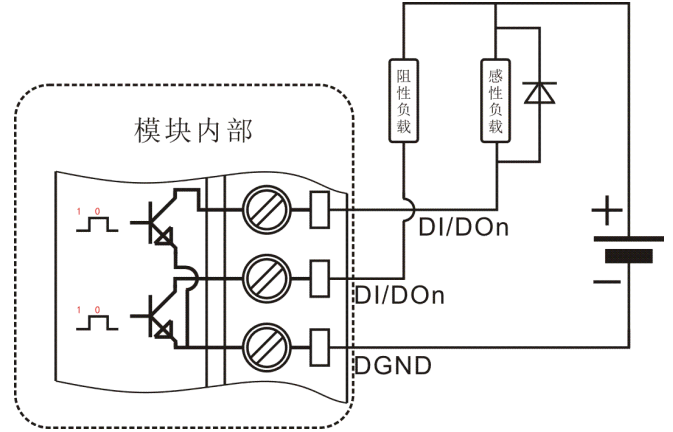 DAM-6081模塊開關(guān)量輸出采用NPN三 管集電 開路輸出,輸出有效電平為低電平;當(dāng)對相應(yīng)端口寫“0”時輸出有效,三 管導(dǎo)通;當(dāng)對相應(yīng)端口寫“1”時輸出無效,三 管關(guān)斷。