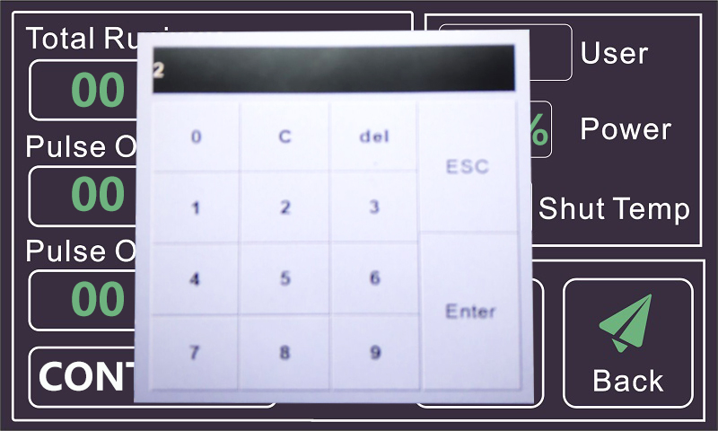 可查看運(yùn)行界面顯示 | 運(yùn)行時(shí)間、工作時(shí)間、停止時(shí)間、過載溫度及實(shí)時(shí)溫度、功率輸出比、工作模式、返回鍵、暫停 |