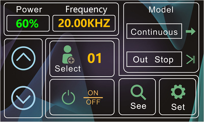 主界面顯示參數(shù) | 功率百分比、工作頻率、運(yùn)行模式、用戶組、設(shè)定鍵、設(shè)備運(yùn)行狀態(tài)、啟動(dòng)/關(guān)閉、設(shè)備運(yùn)行參數(shù)詳情鍵 |