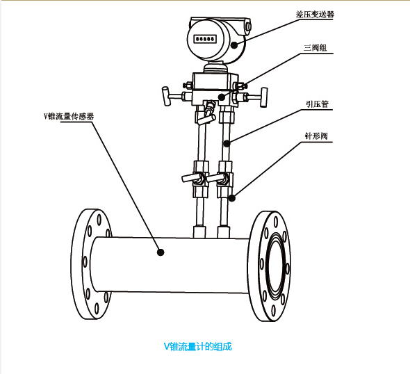 V形錐體和導(dǎo)流管是預(yù) 經(jīng)過精密加工好的,流體在流經(jīng)V錐體時,V錐體的結(jié)構(gòu)和形狀使得流體在收縮前有 個平滑的過度區(qū),流體并不是被迫收縮到管道中心線附近,而是逐漸朝向管內(nèi)邊壁收縮,在前后兩端會產(chǎn)生差壓,配上相應(yīng)的差壓變送器和附件(三組閥、取壓閥等)組成V錐流量計,從而測量出流量。
