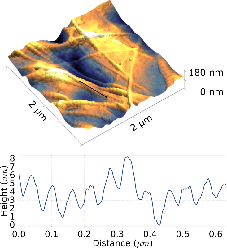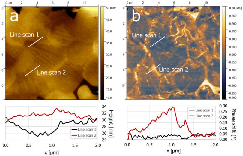 在3V的電壓下FusionScope的a)原子自理顯微鏡(Atomic Force Microscopy, AFM)對樣品形貌的成像效果和b) 靜電力顯微鏡(Electrostatic Force Microscopy, EFM)下相同電壓且同***區(qū)域的成像結(jié)果