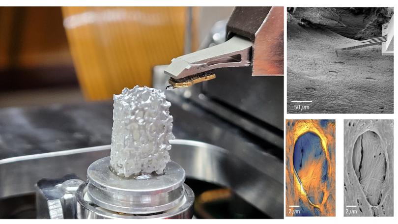 人工骨骼樣品放置在FusionScope的樣品臺(tái)上。右方為FusionScope對人工骨骼的特定區(qū)域進(jìn)行三維表征