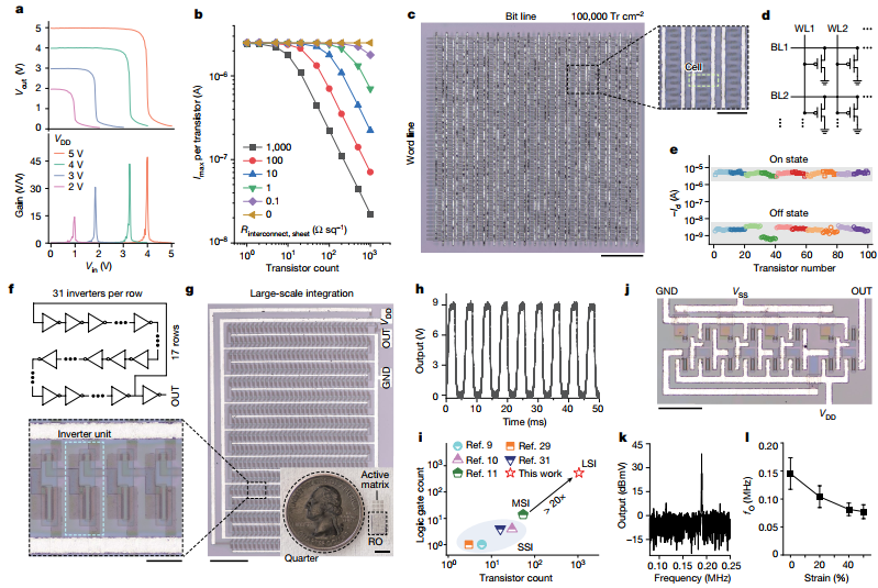 圖4. 由晶體管所構(gòu)成的集成電路。a) 輸出增益電壓的改變;b) 驅(qū)動(dòng)電流的模擬結(jié)果;c)高密度集成電路的光學(xué)照片;d)電路構(gòu)成示意圖;e)高密度電路的測(cè)量結(jié)果;f)和g)大規(guī)模集成電路的示意圖;h) 527***環(huán)形振蕩器的輸出波形; i)本工作和報(bào)道工作的對(duì)比;j)三***慣性振蕩器的照片;k)10個(gè)振蕩器中,輸出快的頻率圖譜;l)不同應(yīng)變條件下的震蕩頻率。