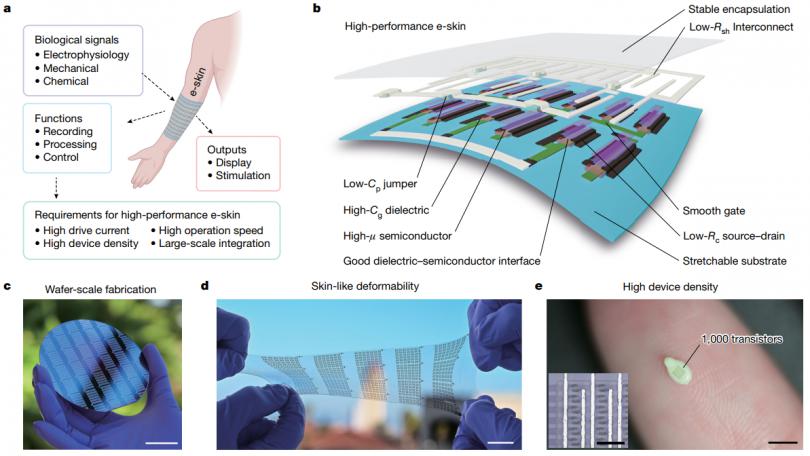 圖1.本征可拉伸,高性能類皮膚電子器件。a)本征可拉伸的傳感器的核心地位以及高性能要求的示意圖;b)高性能本征可拉伸電子器件的三維示意圖; c)在4寸硅片上制備高性能器件;d)在大尺寸柔性基底上制備可拉伸的電子器件;e)高密度傳感器(1000個(gè)晶體管)制備在***顆芝麻上。