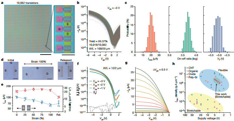 圖3. 本征可拉伸電子器件的電學(xué)和力學(xué)特性;a)所制備的電子器件的光學(xué)照片;b)10082個(gè)晶體管,良率為99.37%; c)晶體管的電學(xué)特性;d)電子器件在未拉伸,***拉伸和釋放拉伸后的情形; e)電子器件的電學(xué)性能隨著拉伸的變化;f)和g)電子管的輸出特性;h)本工作和以前工作的比較。