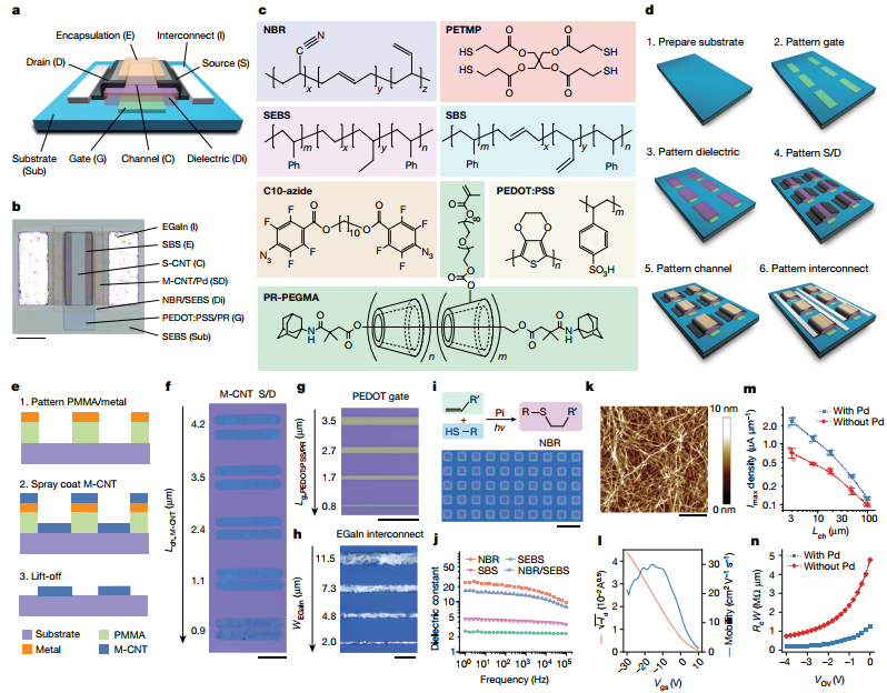 圖2. 本征可拉伸電子器件通過光刻進(jìn)行制備的流程圖。a)示意圖和b)本征可拉伸電子器件的實(shí)物圖;c)用于制備可拉伸電子器件的材料的示意圖;d)可拉伸電子器件的制備過程;e)制備圖案化碳納米管的流程示意圖;f)圖案化的碳納米管;g)PEDOT門;h)EGaln導(dǎo)線;i)絕緣層;j)絕緣層材料的絕緣特性;k)碳納米管的AFM;l)碳納米管傳感器的場(chǎng)效應(yīng)電子遷移率;m)在有無Pd納米顆粒條件下的大規(guī)模真核特性;n)有無Pd條件下的接觸電阻。