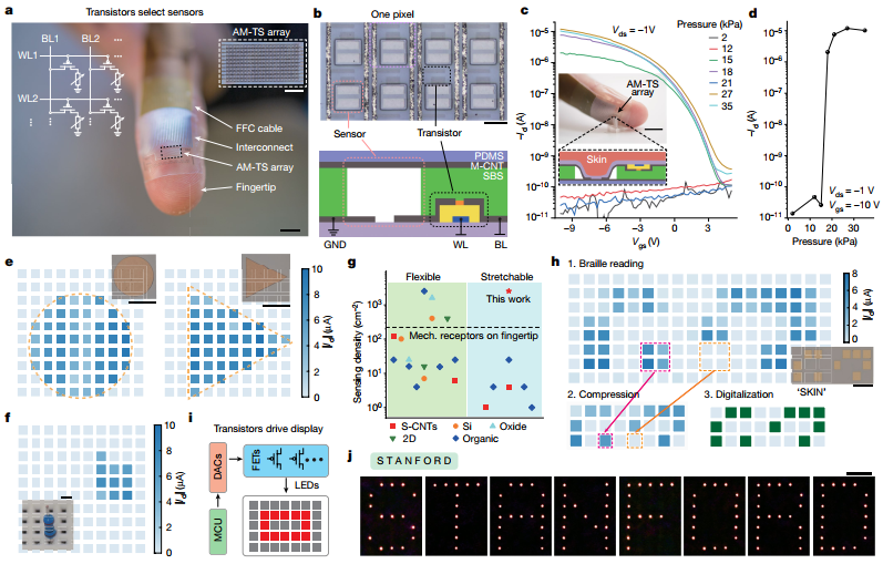 圖5.可拉伸電子器件用于觸覺感知和LED顯示。a)感知傳感陣列的設(shè)計(jì)圖和實(shí)物圖;b)傳感器的光學(xué)照片;c)不同壓力下的電流和d)電壓;e)不同形狀觸壓下的電流;f)在插入金屬棒時(shí)的表現(xiàn);g)本工作和其他工作相比較的結(jié)果;h)在傳感器上按壓盲文SKIN的結(jié)果;i)LED顯示電路;j)作為LED顯示的結(jié)果。