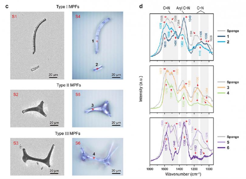 O-PTIR光譜點(diǎn)1 - 4與未磨損海綿的O-PTIR光譜不同。海綿的碳氮雙譜帶(1558和1506 cm?1)在MPFs(范圍從1600到1456 cm?1)中表現(xiàn)出增寬,相對強(qiáng)度略有變化。MPF上1340 cm?1(芳基C-N帶)與1558 cm?1(C-N帶)的吸收強(qiáng)度之比增加或減少。此外,在磨損海綿的洗滌沃茨中檢測到較小的微塑料碎片(3 - 10 μm)(圖e),其O-PTIR光譜(圖d,點(diǎn)5和6)與長I型MPF(圖d,點(diǎn)1)相似。摩擦熱不會導(dǎo)致MPF上的聚合物分解,因?yàn)楹>d磨損期間金屬表面的溫度升高(從21.5 ° C至24.9 °C)低于三聚氰胺熱解引發(fā)的閾值(379?387°C。然而,在海綿中存在水和甲醛殘留物的情況下,機(jī)械能可能通過縮醛胺基團(tuán)(? NH-CH2-NH-)和羥甲基基團(tuán)(? NH-CH2-OH)之間的交替水解和縮合反應(yīng),誘導(dǎo)破壞或形成三聚氰胺-三聚氰胺交聯(lián)。