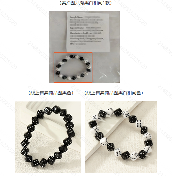 建議:如果銷售sku有多個顏色,每個顏色都需要在實(shí)拍圖中體現(xiàn)出來,實(shí)拍圖不可少拍/漏拍/不拍,實(shí)拍圖商品需要與線上銷售商品保持***致。因此需要補(bǔ)拍黑色款式手鏈的實(shí)拍圖,并上傳。