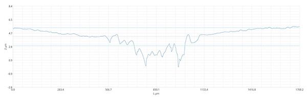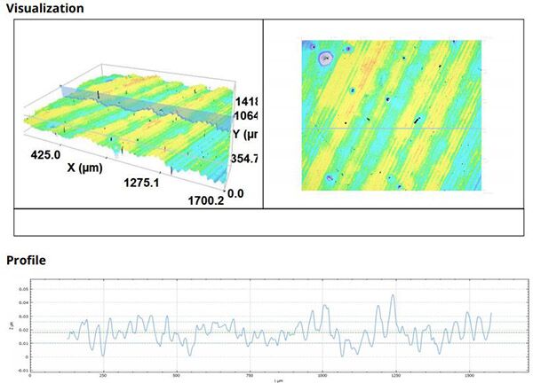 此外,還可以輕松測量樣品的表面粗糙度和輪廓粗糙度,然后對比使用共聚焦和干涉測量這兩種不同的測量技術(shù)獲得的數(shù)值。通過這種方式,可以保證得到的粗糙度值的精度?;牡拇植诙瓤赡苁峭繉优c基材之間附著力的決定因素。