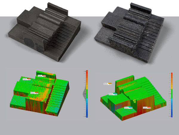 3D比對顯示了SLM制造零件相對于參考的差異。我們可以看到,在樣品幾何形狀的邊緣可見更大的偏差,但使用這兩種材料整體形狀得到了保持。然而,由于球化效應(yīng)的原因,由鋁合金制成的樣品在表面的某些部位顯示出***些較高的偏差[2]。
