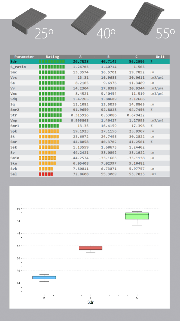 圖3.不同打印角度的示意圖,以及測量組A (25o打印角度的樣品)、測量組B (40o打印角度的樣品)和測量組C (55o打印角度的樣品)測得的表面粗糙度參數(shù)