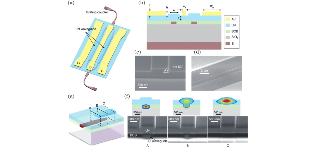 圖3 硅/鈮酸鋰混合MZM。(a)結構示意圖;(b)波導橫截面示意圖;(c)~(d)LN波導橫截面金屬電極SEM圖像;(e)~(f)垂直耦合器示意圖與橫截面SEM圖像