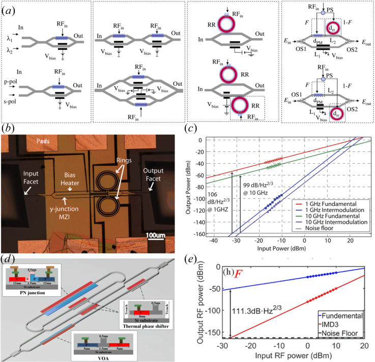 圖2 微環(huán)+MZM法。(a)IMPACC配置結構(左到右:雙輸入MZM,MZM串/并聯(lián),單RAMZM和雙RAMZM,IMPACC的兩種配置方式);(b)~(c)雙微環(huán)輔助MZM顯微圖與測試SFDR結果;(d)~(e)硅基可重構RAMZM示意圖與測試SFDR結果