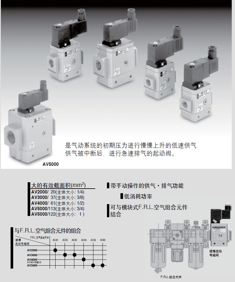 1.SMC緩慢啟動電磁閥AV3000-03-5DZ:   * 緩慢啟動電磁閥可用于系統(tǒng)的安全保護作用。氣動初期