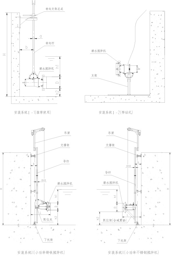 潛水?dāng)嚢铏C必需完全潛入水中工作;不能在易燃易爆或有強腐蝕性液體的環(huán)境中工作;鋼膨脹螺栓須按要求固定,安裝完畢后,必須將電纜拉緊固定好.