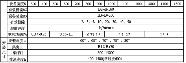 必備:渠道的寬度(或者設(shè)備的寬度)B、渠道的深度H、格柵柵隙b、耙齒材質(zhì)要求、機(jī)架材質(zhì)要求。