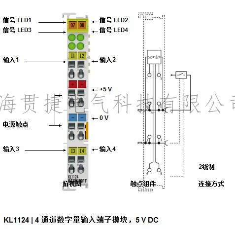 KL1124 數(shù)字量輸入端子模塊從處理層獲得二進(jìn)制控制信號(hào),并以電氣隔離的形式將這些信號(hào)傳輸?shù)礁邔拥淖詣?dòng)化單元。每個(gè)總線端子模塊含有 4 個(gè)通道,每個(gè)通道都有 個(gè) LED 用來(lái)顯示其信號(hào)狀態(tài)。通過(guò) KL9505 電機(jī)啟動(dòng)器端子模塊可以生成 5 V 電源電壓,并饋入至電源觸點(diǎn)中。