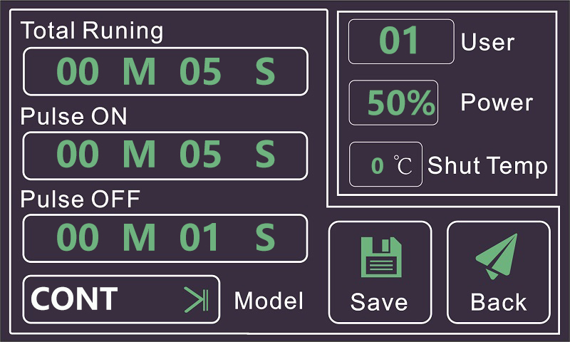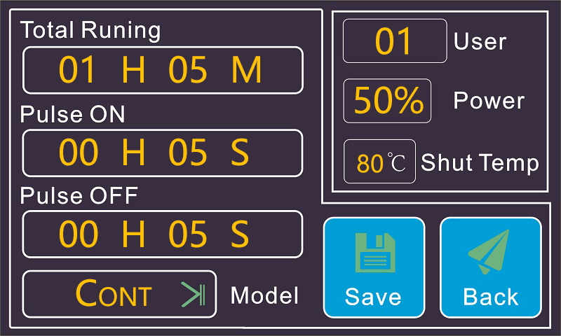 可查看運(yùn)行界面顯示 | 運(yùn)行時(shí)間、工作時(shí)間、停止時(shí)間、過載溫度及實(shí)時(shí)溫度、功率輸出比、工作模式、返回鍵、暫停 |