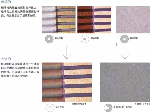 BX53M的MIX組合式觀察技術(shù)組合了明場和暗場照明方法。對突出顯示缺陷和區(qū)分隆起與凹陷表面很有用處。