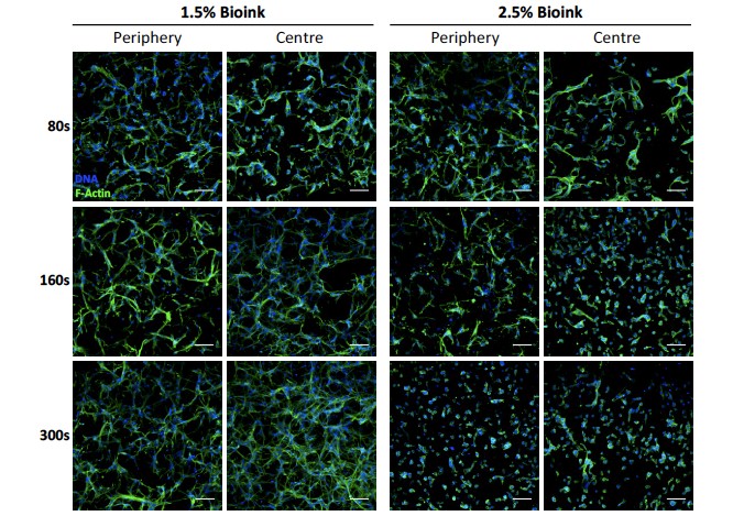 不同生物墨水濃度和紫外線光交聯(lián)時(shí)間的3D結(jié)構(gòu)對皮膚成纖維細(xì)胞的形態(tài)影響(細(xì)胞培養(yǎng)7天,比例尺:100um)