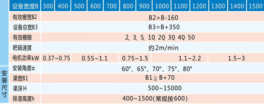 必備:渠道的寬度(或者設(shè)備的寬度)B、渠道的深度H、格柵柵隙b、耙齒材質(zhì)要求、機(jī)架材質(zhì)要求。