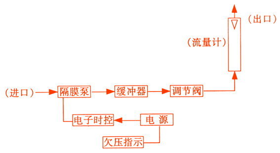 采樣器整機(jī)主要部分由隔膜泵、調(diào)節(jié)閥、緩沖器、流量計(jì)、電子時(shí)控電路、欠壓指示電路和電源等部分組成。