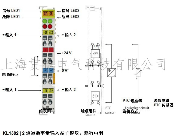 數(shù)字量輸入端子模塊 KL1382 借助電流回路和低于 5 V 的電壓分析熱敏電阻傳感器的輸入信號(hào)。KL1382 是 種用于 PTC 傳感器熱機(jī)保護(hù)的監(jiān)控設(shè)備,適用于對(duì)電機(jī)、軸承以及其它設(shè)備進(jìn)行直接監(jiān)控。在過(guò)程映像中, 個(gè)位指示傳感器的狀態(tài),另 個(gè)位報(bào)告短路或斷線情況。紅色或綠色 LED 指示兩個(gè)輸入位的狀態(tài)。