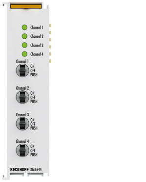 數(shù)字量輸入端子模塊 KM1644 用于直接手動輸入至過程數(shù)據(jù)。 四個開關(guān)將其狀態(tài)信息作為數(shù)字位信息傳輸至控制系統(tǒng)。 四個 LED 用來指示過程數(shù)據(jù)中的四個輸出位,但不能直接通過開關(guān)啟動。